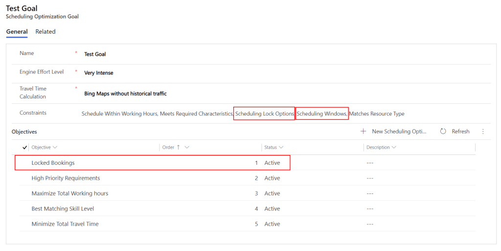 Setup: In the goal, Scheduling Windows’ and Scheduling Lock Options to be set as constraints. This instructs RSO to not to violate the current promised date and time of the booking and/or the resources if opted. Also, to avoid the resource double booked i.e. avoid the existing locked booking to be ignored while optimization. To achieve this, ‘Locked Booking’ has to be added an objective with high ranking.