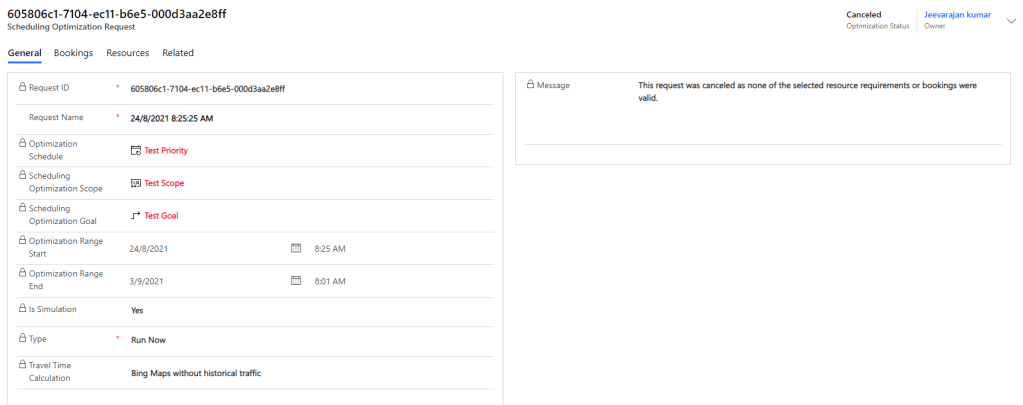 In the optimization schedule, set the ‘Run as simulation’ to Yes to make the RSO run as a simulation. Make sure you’ve published the changes to take effect. To trigger immediately, click ‘Run Now’, also check Tip 3 On-demand trigger for more details. Once run, open the Scheduling Optimization Requests for details on the bookings that have been created.