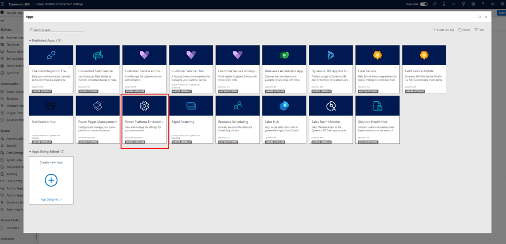 Today when I tried to open advanced settings as usual, realized that the old ‘Settings’ menu has got a total revamp and replaced by an app named, ‘Power Platform Environment Settings’.