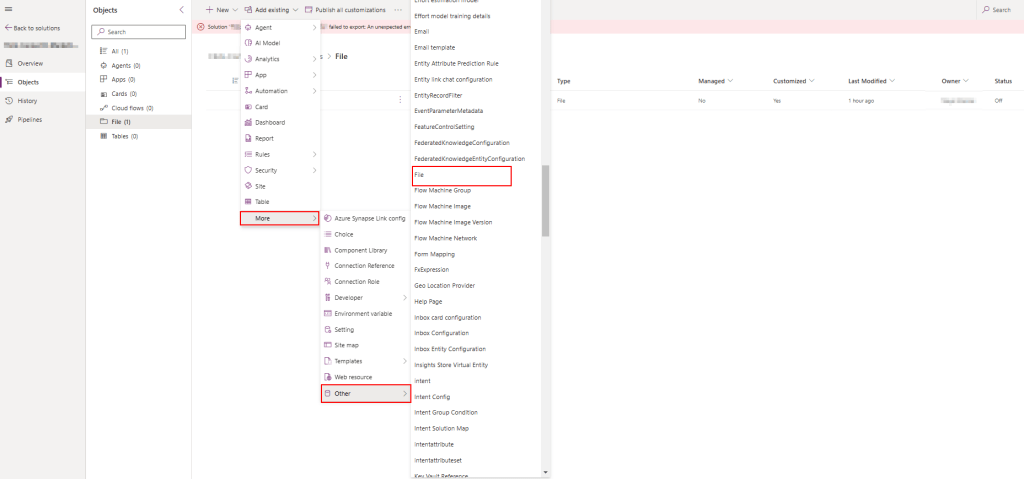 However, I recently faced another issue while trying to export the solution. The export kept failing without any details about the error, it was just throwing below error, ‘[solution] failed to export. An unexpected error occurred.’