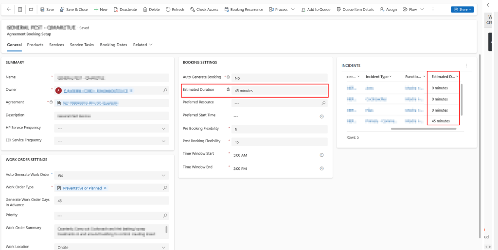 If the Estimated Duration in the Agreement Booking Incident is adjusted after generating work orders, it won’t have an impact on the already generated work orders, however, the following work orders that are waiting to be generated from the Agreement Booking Dates will have the updated Estimated Duration from the Agreement Booking Setup (sum of all associated Agreement Booking Incidents).
