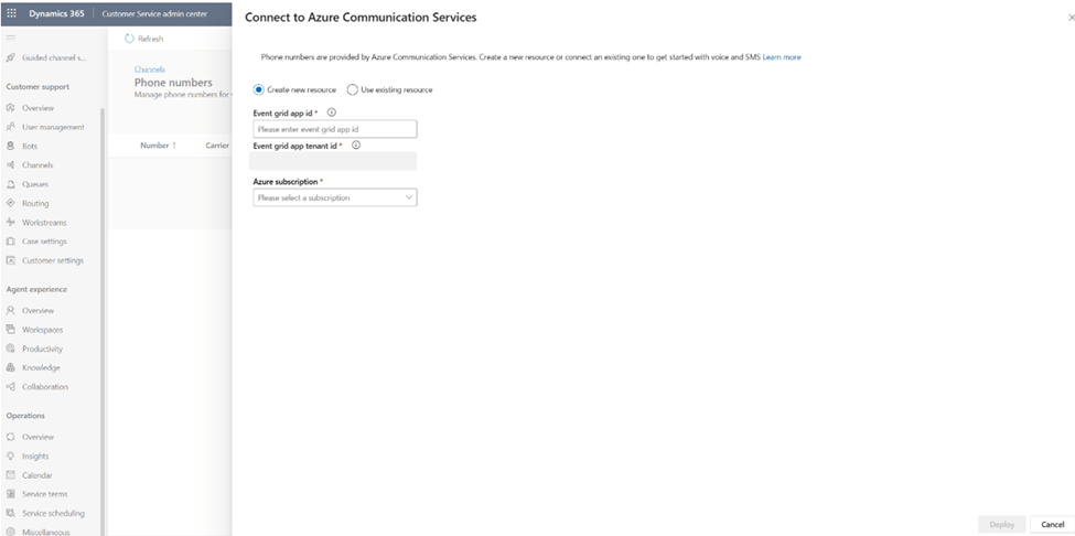 If you have already purchased a number in ACS or imported your telco-provided phone number via Azure direct calling, you can link it to the contact centre here.