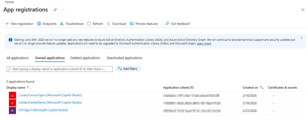 Note: If you have already created Agents from the Copilot Service admin center, it will show in the App Registration, and you can use its App Id as well.