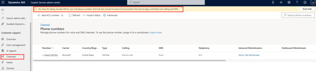 To set up a call channel, you will need a phone number. When you avail of the Contact Centre trial, you’ll get a free US toll-free number with 60 mins free mins. Once the trial is ended, or if you need a custom phone number, you can end the trial and get the phone number via Azure Communication Services (ACS).
