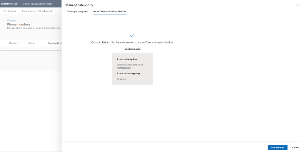 Now your org is connected to ACS, and you have a phone number in the Copilot Service admin centre.