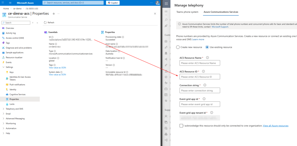 - Navigate to the Azure Communication Service resource under the resource group -> copy Id of the resource group into ACS Resource Id