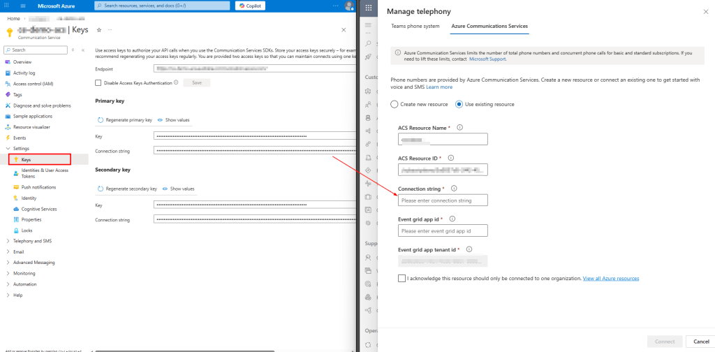 - Within the Azure Communication Service resource -> copy Connection string from Keys