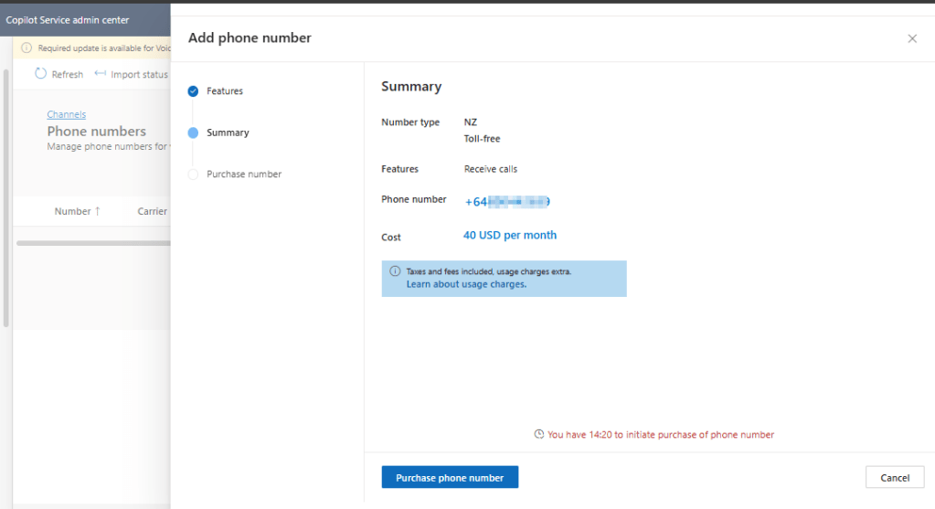 Purchasing a new phone number from the Copilot Service admin centre: