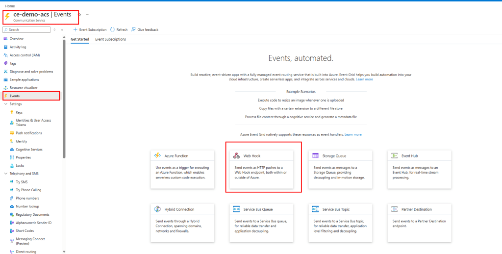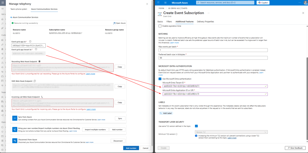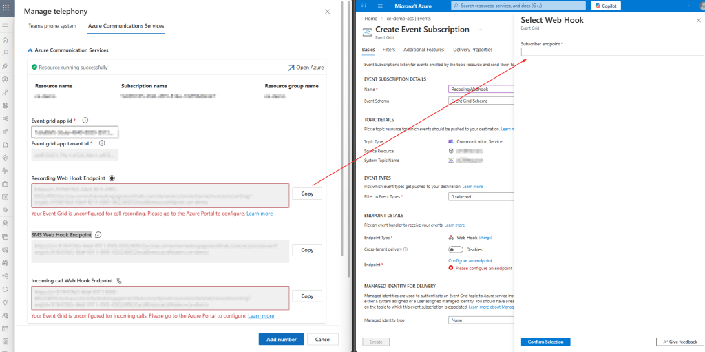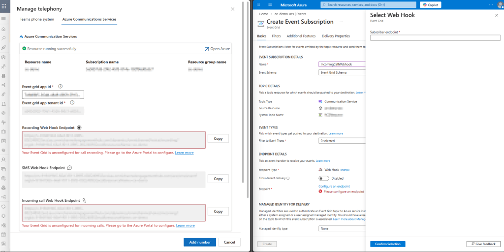 ACS can receive calls, but D365 Contact Center needs event notifications to route calls, track recording events, and handle SMS. That’s why we configure Event Grid webhooks and connect them to the endpoints provided by D365.