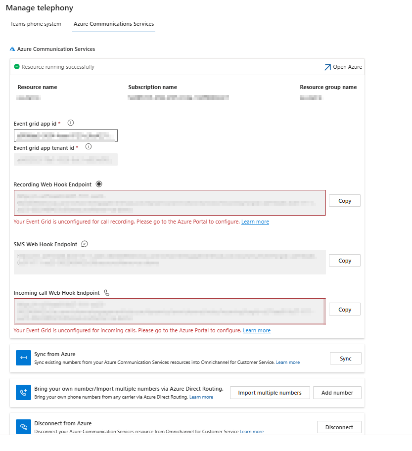 In Copilot service admin cetner, you will see the below errors which we are going to resolve, which enables call recording and SMS services in this blog posts. We will first configure your applications to listen to Azure Communication Services events by registering Event Grid System Topics. Then, subscribe to the specific incoming call, call recording, or SMS events by creating Event Grid subscriptions on the Azure portal. More details: https://learn.microsoft.com/en-us/dynamics365/customer-service/administer/voice-channel-configure-services